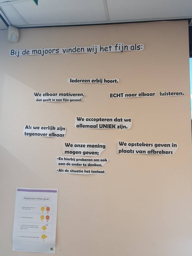 - Is er sprake van zelfbeheer, waarbij het groepsoverleg (of, in Freinettermen, de klassenvergadering) een belangrijke rol speelt? Worden leef- en werkregels samen vastgesteld, gehandhaafd en geëvalueerd?